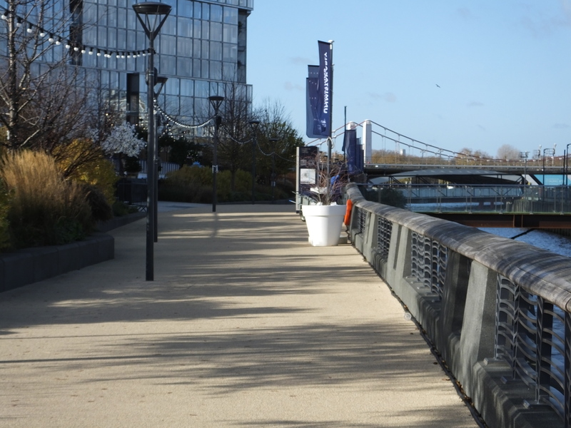 Having walked inland to turn right you pass a flower bed to the right. Here on the ground are two metal strips marking the entrance to Topping’s Wharf.