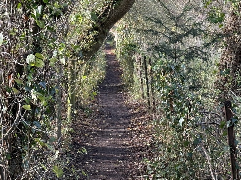 The wide driveway passes the house (left). After Fairfield (left) the way descends and narrows. A long enclosed footpath leads to the river.