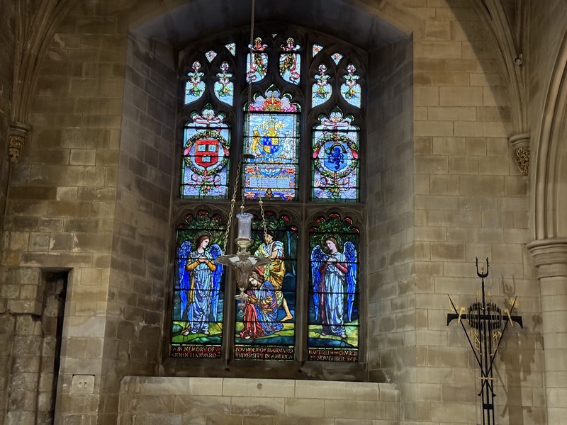 The chapel’s east window is by American John Farge and donated in 1907 by the US ambassador who declared: ‘We reiterate the hope that all Harvard men will come to the rock from which they were hewn and to the hole of the pit from which they were rigged to the place where the founder of this great University spent much of his youth, and so add more links which bind this old country with the new.’